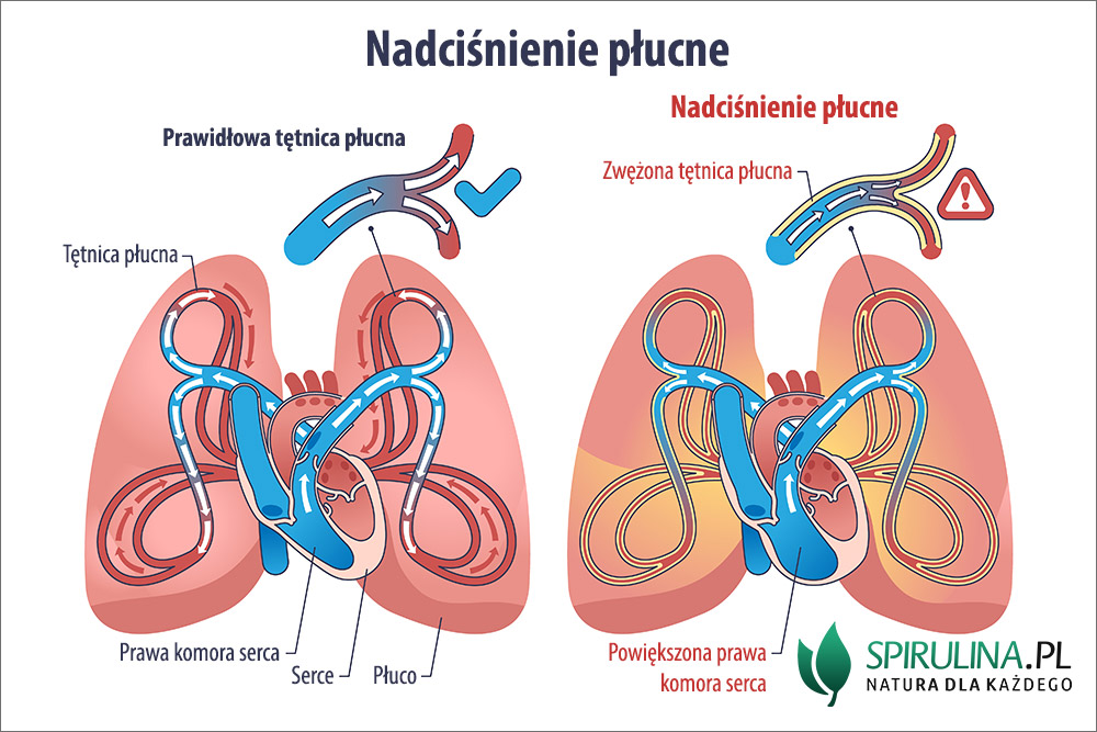 - leczenie farmakologiczne – inhibitory fosfodiesterazy typu 5 (np. sildenafil, tadalafil), które rozszerzają naczynia płucne, a także antagoniści receptora endotelinowego (np. bosentan, ambrisentan), które zmniejszają napięcie naczyń. Zastosować można też stymulatory cyklazy guanylanowej (np. riocyguat), ponieważ poprawiają przepływ krwi przez płuca;