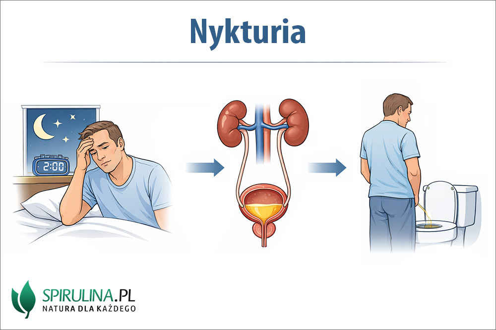 - częste wybudzanie się w nocy z powodu uczucia parcia na mocz, a tym samym oddawanie moczu co najmniej raz w nocy, często 2-3 razy lub więcej;